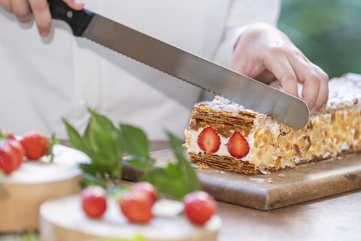 ライブキッチンからは、パティシエがその場で仕上げる出来立てのナポレオンパイを。