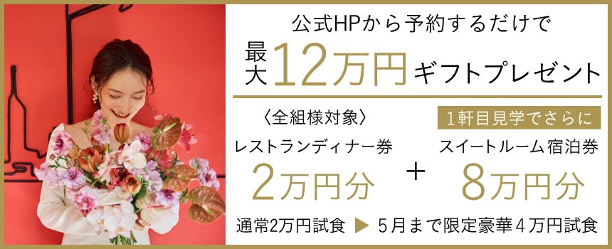 公式HPより見学のご予約をいただいた場合、式場紹介・相談カウンターやその他WEBサイトからのご予約と比べて、仲介紹介料が掛からない為お客様に100%還元することができます。